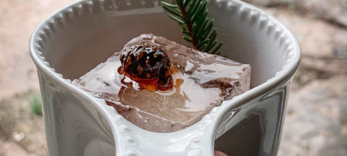 Ekorrarna har sparat små, små gröna tallkottar på tallarna för mig att varsamt plocka och koka ner till en bärnstensfärgad tallkottesockerlag som blir smakbäraren i denna skogiga old fashioned.
